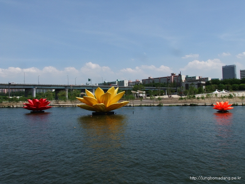 세빛둥둥섬에 띄워놓은 연꽃 조형물이 신기합니다.