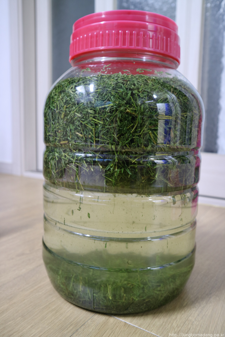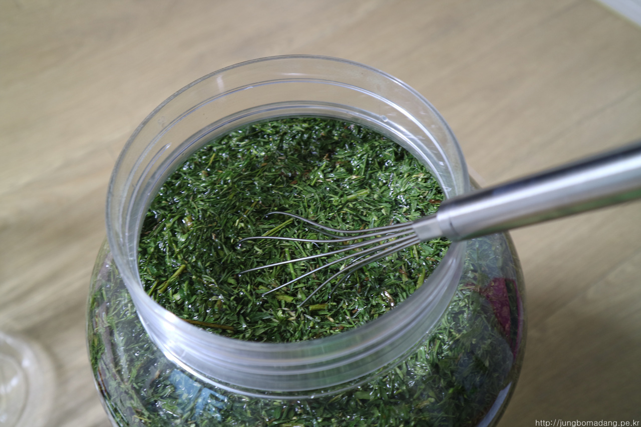 흘리지 않게 잘 넣고, 나머지 담금주 1병을 마져 붓고, 야관문 건초를 더 넣고! 요래 마무리는 거품기로 눌러서 야관문 건더기를 모두 담금주에 확 담궈 부립니다.