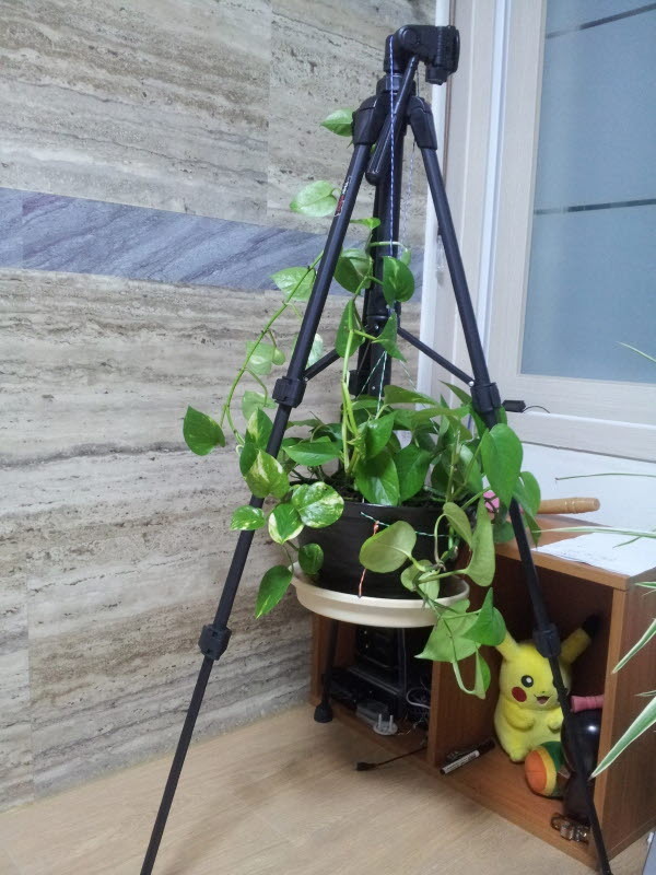 애플민트를 다치게한 육중한 스킨답서스는 천정에 다시 고정하지 않고 일단 튼튼한(?) 삼각대에 고정시켜 두었네요...