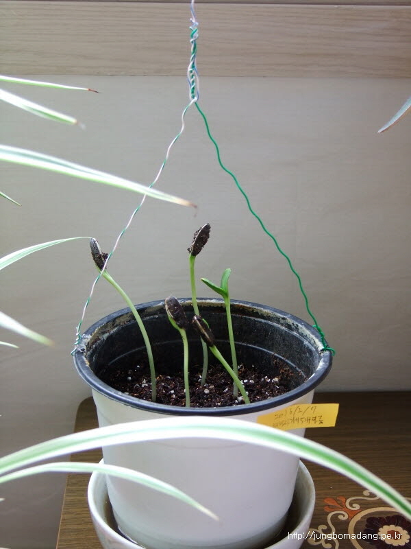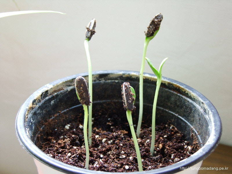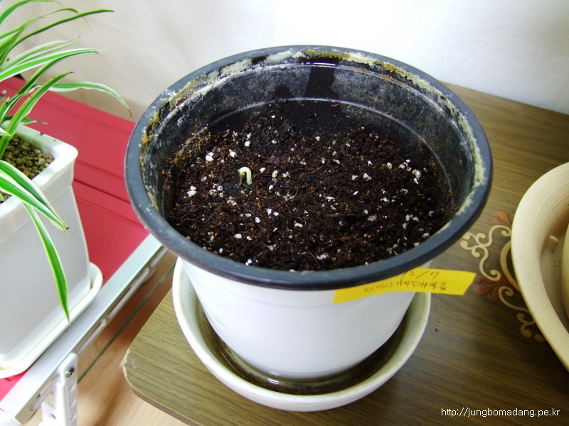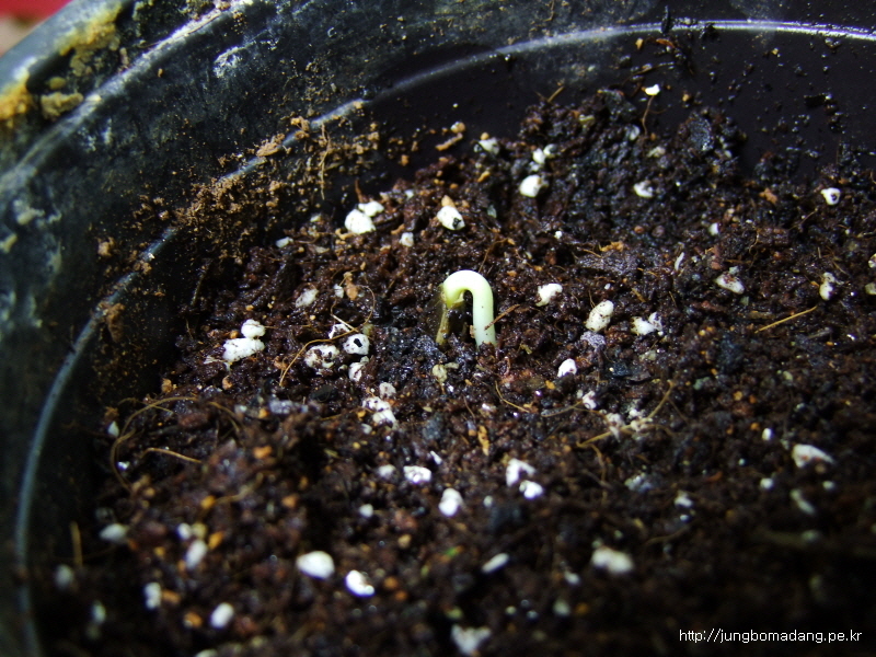 5립 중에 1개가 땅을 뚫고 나오고 있습니다. 떡잎 보일려면 열흘정도 걸린다는 데 얼추 시간이 맞는 거 같네요. 나머지도 곧 나오겠죠 ㅎㅎㅎ