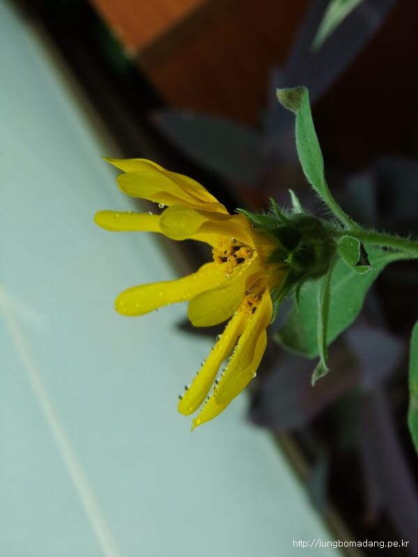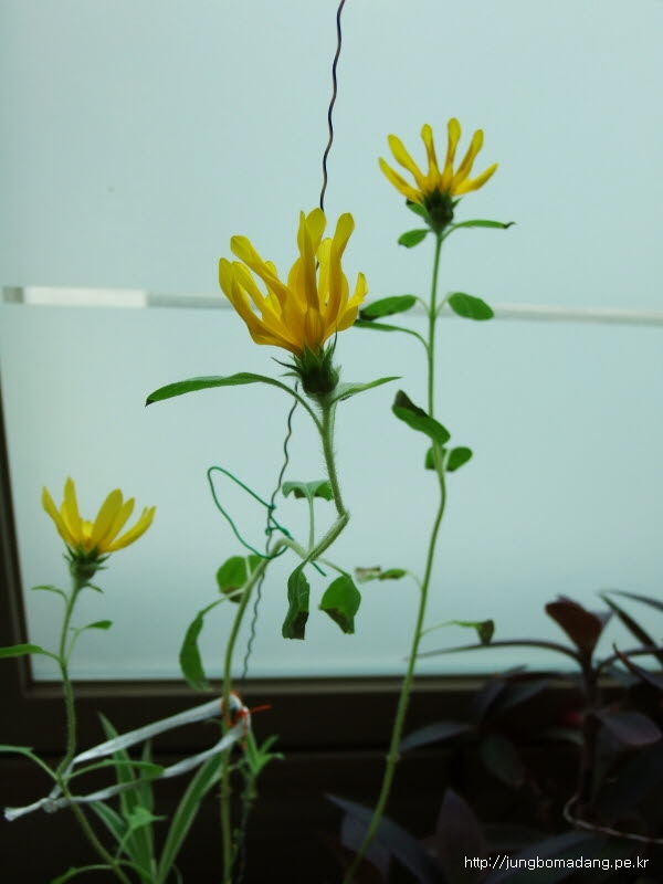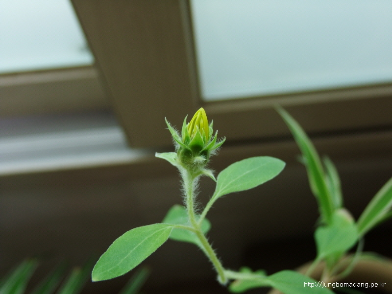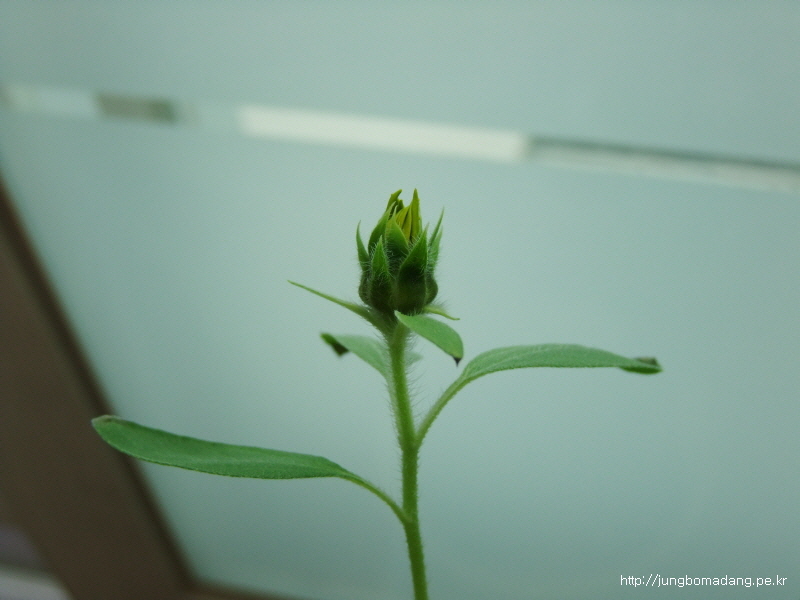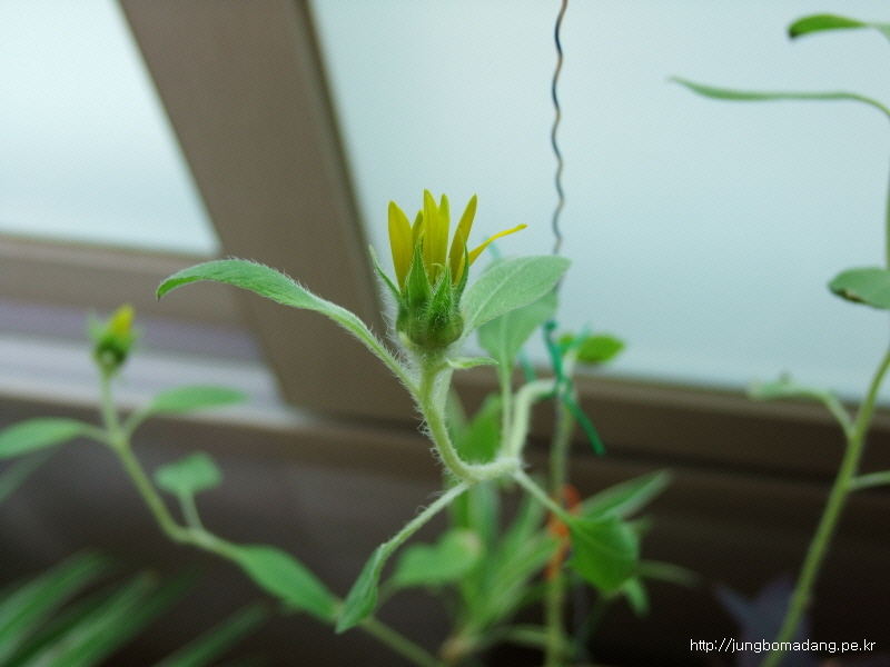 줄기가 영양이 부족한지 가늘고, 잎도 상태가 안좋은 데 꽃이 피기 시작하다니 신기합니다.