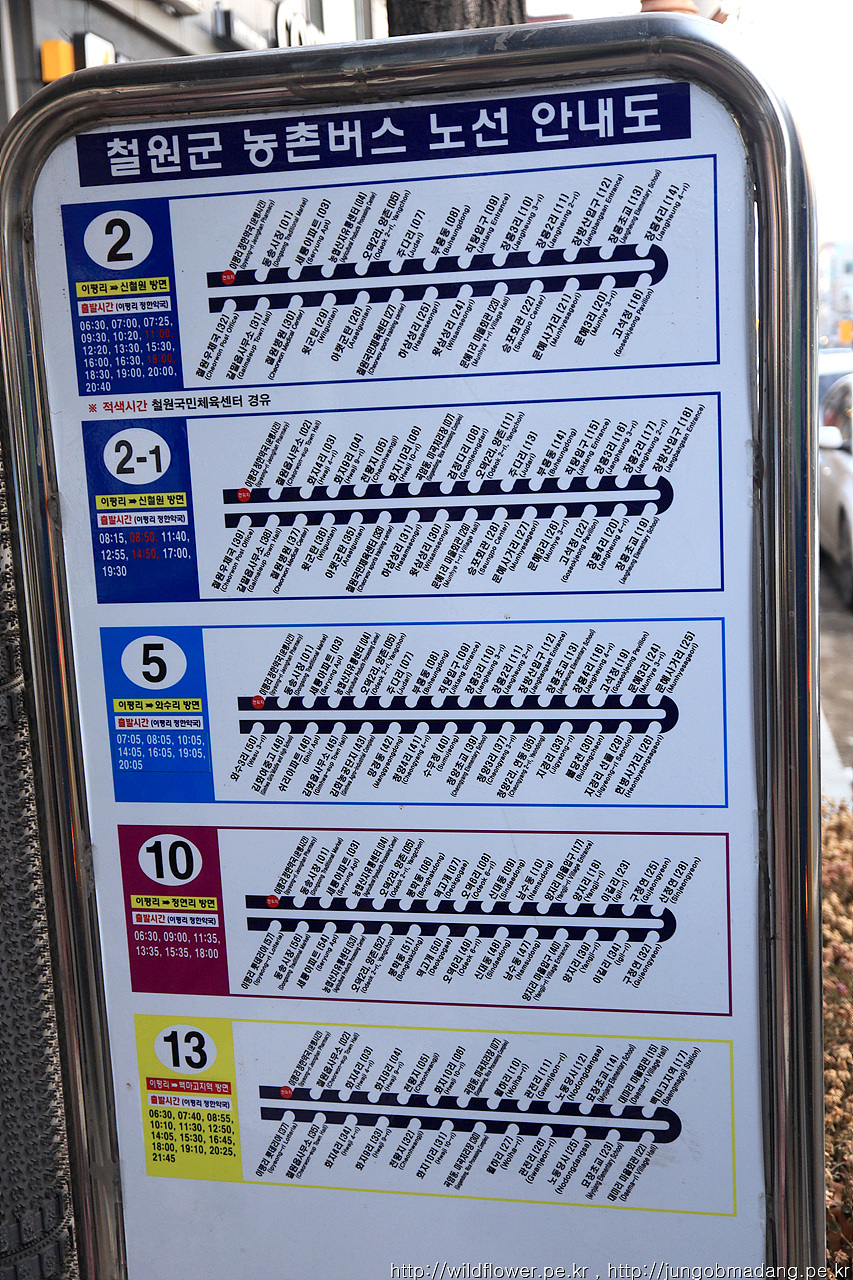버스 정류장의 시간표를 찍어봅니다. 13번 버스는 참고로 (구)철원인 동송(이평리)까지 오고가는 버스 입니다.