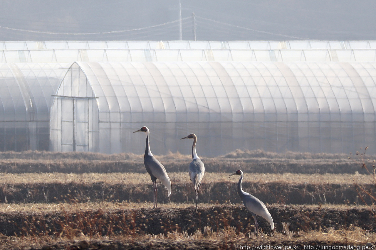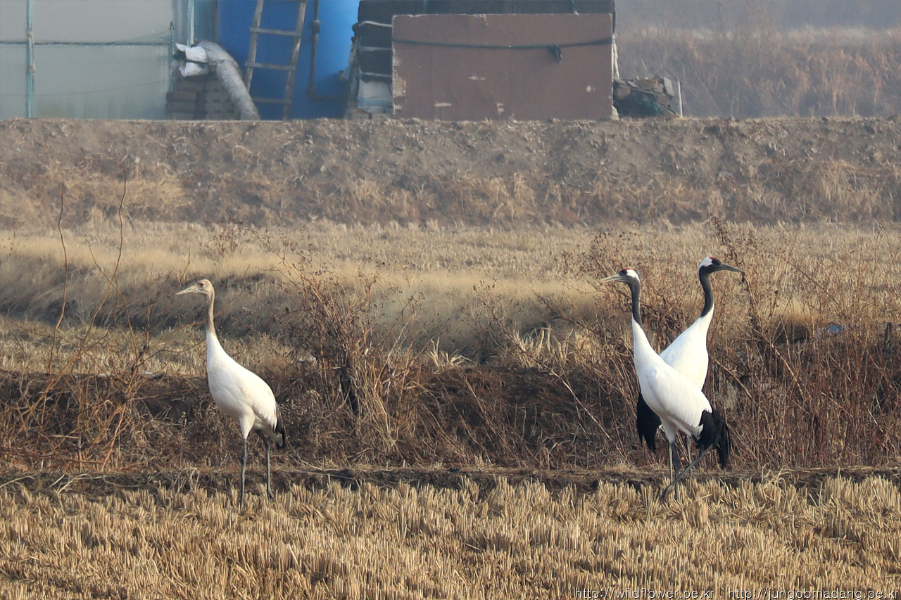 가만히 보면 머리 부분이 황색인 녀석이 있는 데 이 녀석은 어린새(새끼) 그 양옆에는 부부(암,수)로 생각됩니다. 두루미 가족은 보통 3-4마리(암수 어미 2, 새끼1-2)로 이뤄진다고 하네요. 암수 구별은 육안으로 쉽지 않고 울음 소리로 구별되는 데 예민한 녀석이라 멀리서 소리로 구별하기 쉽지 않습니다.