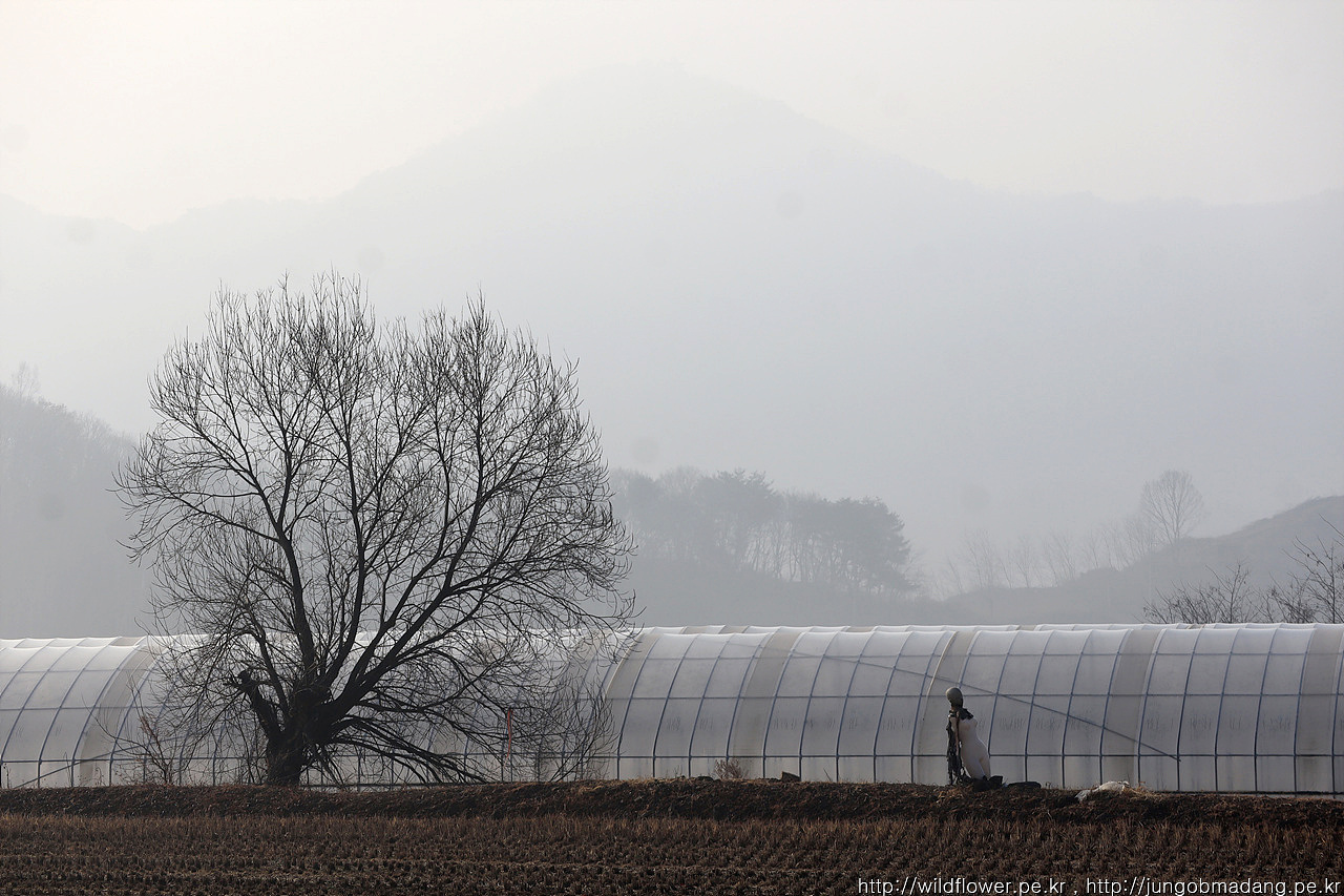 태극기와 자작나무의 숲 - 두루미와 재두루미와의 만남을 뒤로 하고 철수 합니다. 태극기와 자작나무로 이루어진 길을 지납니다. 정면에는 안개 때문에 잘 보이지 않는 백마 조형이 보입니다.
