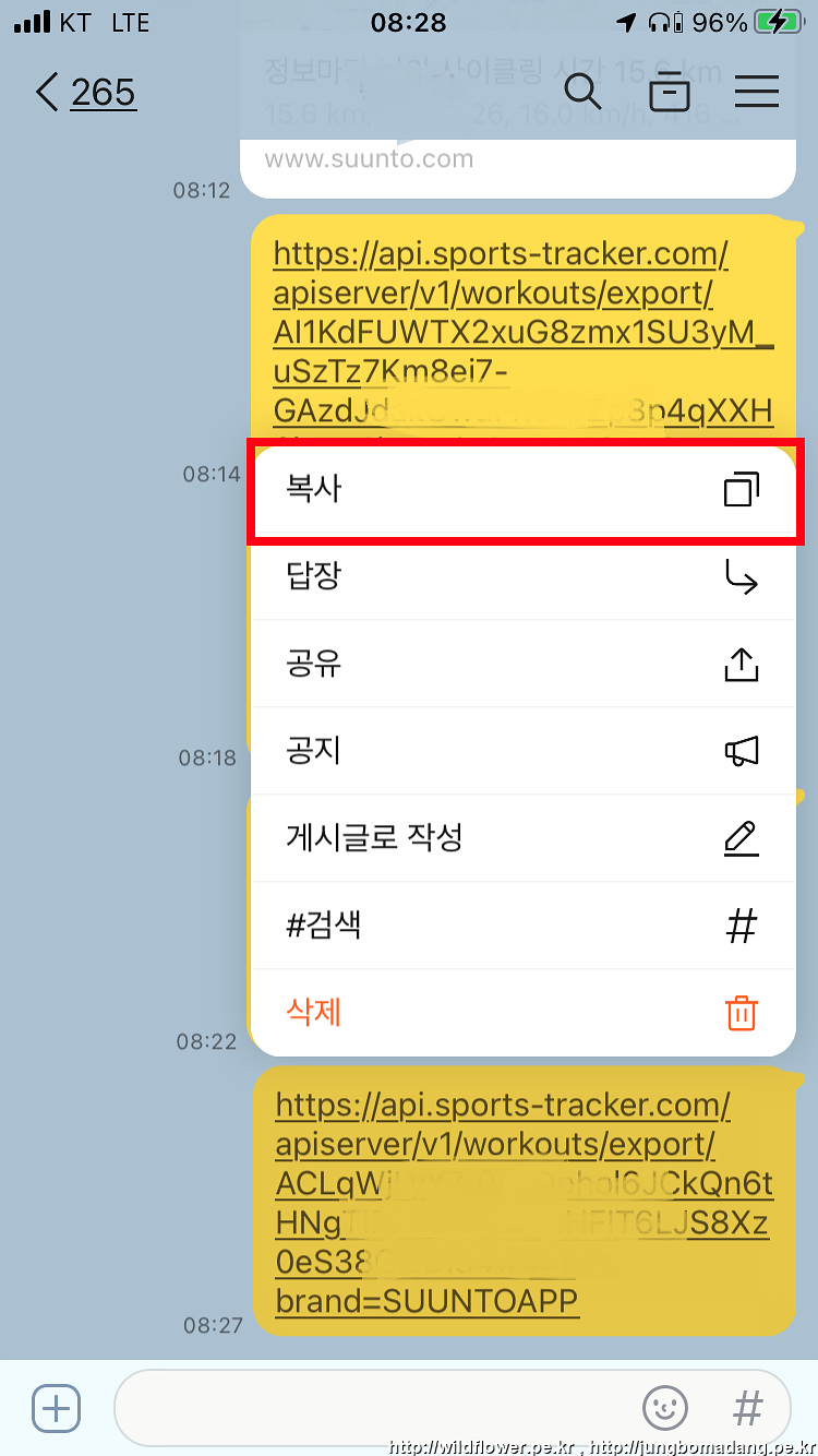 6. 카카오톡 앱을 실행하고 방금 보내진 채팅 메시지를 확인하고, 해당 링크를 길게 누르면