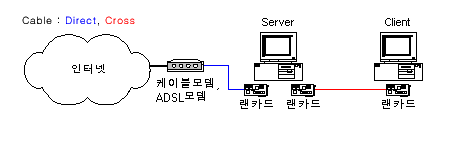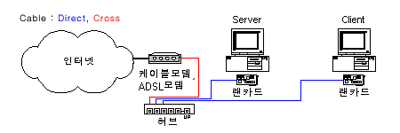 - ADSL모뎀 - 허브 : 다이렉트 케이블(허브쪽은 Uplink) or 크로스 케이블(양쪽 모두 Normal Port)